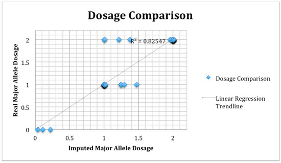SNP validation by Sanger sequencing. Plot of Sanger sequence minor allele dosage vs. the imputed minor allele dosage. A set of 57 samples (n = 25 cases and n = 32 controls) was chosen for validation using rs36067110 on 1p36.13 as a representative SNP. The overall correlation coefficient of imputed SNP dosage vs. Sanger sequence SNP dosage was 0.826.