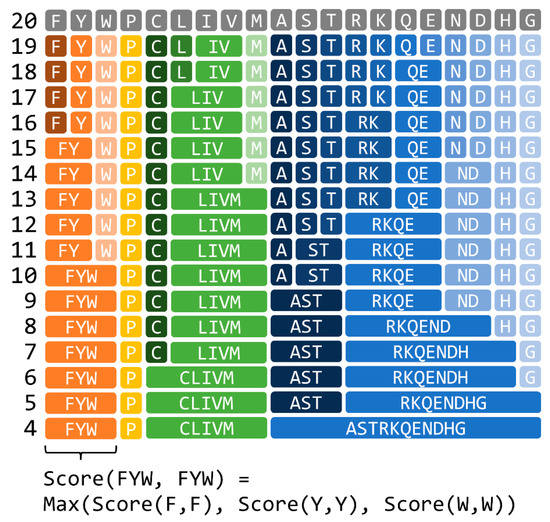 A reduced amino acid character represents a cluster of standard amino acids, as shown in Figure 1. Treating a match of amino acids represented by the same reduced amino acid alphabet as a perfect match provides a fast relaxed search that allows the substitution of an amino acid with a similar amino acid. In this study, we used the reduced amino acid alphabets generated using the method proposed by Murphy et al., based on the BLOSUM62 substitution matrix, which describes the similarity score between each of the 20 standard amino acids. First, correlation coefficients were calculated for all pairs of amino acids based on the BLOSUM62, and then the amino acids were grouped by hierarchical clustering. The size of the reduced amino acid alphabet was user-defined, ranging from 4 to 18 characters in the current study. The maximum score obtained by a perfect match of any standard amino acid in the group was used to define the match score for a matching reduced amino acid alphabet character in an identical group, as an example is shown in the bottom part of Figure 1.