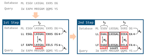In TSSS, the seed search was divided into two steps employing different reduced amino acid alphabets, as shown in Figure 2. In the first step, the database and query sequences were converted into the first reduced amino acid alphabet, A1. Subsequences starting from all possible positions of the query sequence were enumerated (referred to as seed1) with a residue length of L1. Then, matching portions were searched against the database where seed1 matched, with a Hamming distance ≤ H1.