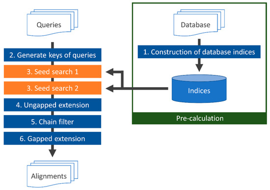 The Smith–Waterman algorithm [2] is the most rigorous method to obtain optimal sequence alignment by means of dynamic programming during a homology search. This algorithm is implemented in SSEARCH [3] and other software; however, SSEARCH is too slow to search against a large number of sequences within a realistic execution time. For this reason, programs that perform fast homology searches are now widely used, such as BLAST [4,5]. Nevertheless, the amount of data has drastically increased with the advent of high-throughput next-generation DNA sequencers. For example, the Illumina NovaSeq6000 DNA sequencer can output up to 6T bases in a single run of a few days, requiring hundreds of thousands of CPU days for BLAST to process that volume of data. Thus, faster homology search programs such as RAPSearch2 [6], GHOSTZ [7], and DIAMOND [8] have been proposed. While there is a tradeoff between search speed and accuracy, further acceleration while maintaining high accuracy is required for comprehensive metagenomic analyses.