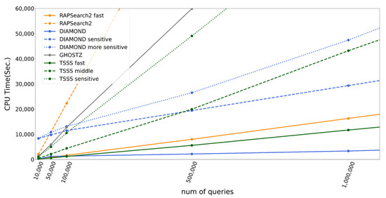 The number of queries greatly affects the calculation time; thus, we tested TSSS and existing tools with various query sizes. Figure 7 presents the execution times and their linear extrapolations since calculation time was almost directly proportional to the number of queries. Interestingly, DIAMOND demonstrated different behavior from the other programs. This is because the time DIAMOND takes to construct the data structure for the seed search appeared as the intercept, which then accelerated the calculation per query time, reflected as the slope inclination. The results demonstrated that the TSSS sensitive method was faster than DIAMOND-sensitive at the same accuracy when the number of queries was small, whereas DIAMOND-sensitive had an advantage when the number of queries was large. DIAMOND-sensitive became faster than the TSSS sensitive method when the number of queries > 120,000 with a length of 150 bases.