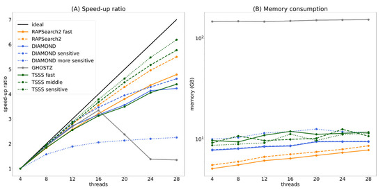 In the speed-up ratio graph (Figure 8A), DIAMOND and the TSSS fast method overlapped and displayed similar parallel efficiency. The TSSS middle method demonstrated better parallel efficiency than both RAPSearch2 and GHOSTZ. Furthermore, the TSSS sensitive method had higher parallel efficiency than DIAMOND-sensitive and DIAMOND-more sensitive. Note that the parallel efficiency of GHOSTZ was significantly decreased when the number of threads was ≥20, which suggests that the seed search was not suitable for parallelization or there may be a problem in the implementation of parallelization.