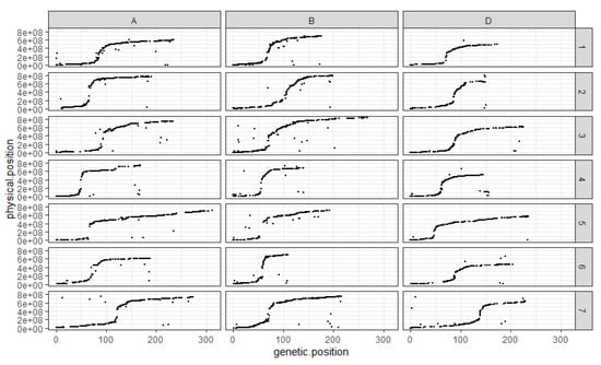 Comparison between markers’ genetic and assumed physical positions for each chromosome in each sub-genome. The x-axis corresponds to the genetic position of the mapped SNP on the RxCS genetic map in cM. The y-axis corresponds to the assumed physical position of the SNP on the chromosome they are on in bp. Each column corresponds to a wheat sub-genome, A, B and D respectively. Each line corresponds to a chromosome number; the chromosomes are numbered 1 through 7. Each black dot corresponds to a SNP.