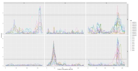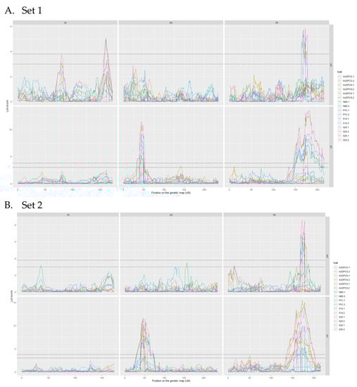 A linkage analysis was carried out using the R/qtl software [56] version 1.42-8. This analysis included for each trait an initial Simple Interval Mapping (SIM), followed by a Composite Interval Mapping (CIM). Analyses were performed replication by replication and set by set (sets only concerning the first lot of phenotypic data). For SIM, 1000 genome-wide permutations were used to calculate the significant logarithm of odds (LOD) threshold. Only QTL that showed p-values < 0.05 were considered significant. The CIM was carried out with the SNP with the highest LOD at QTL peaks used as a covariate. When there were several significant QTL detected, the CIM was recalculated with two covariates, however, this never led to any extra detections. QTL intervals were evaluated with the LOD support interval with a drop in LOD of 1 and the “expandtomarkers” argument as true. QTL effects were calculated with the “effectplot” and “effectscan” functions. Possible epistatic interactions between QTL were looked into using the “addint” function.