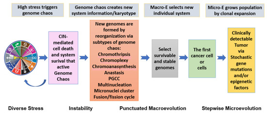 A direct benefit of synthesizing all the above information (from redefining inheritance to illustrating genome chaos as a process for creating new system information) is to establish the model of two-phased cancer evolution. This model comprises a punctuated phase and a gradual stepwise phase. Within the punctuated phase, karyotype changes dominate, and genome-based macro-selection is the key driving force. Within the gradual phase, gene mutations and epigenetic alterations dominate, with microevolution as the key feature. This model can reconcile the contribution of genes as well as karyotypes. It is also useful for both cancer diagnosis and treatment [3,6,8,53,76,120]. As illustrated in Figure 1, the model of two-phased cancer evolution can acceptably integrate and unify stressors, various subtypes of genome chaos, system information creation by genome re-shuffling, the macroevolutionary selection of survivable new genomes, the clonal expansion of the “first cell”, and the involvement of immense gene mutations/epigenetic abnormalities that contribute to microevolution.