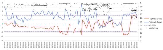 Allele frequency and selection signature for the RSPO2 3’ UTR-linked genomic region on CFA 13. The allele frequencies of 1,225 SNPs in the CFA13:8,110,000−9,110,000 bp region of 56 RSPO2 3’ UTR insertion homozygous dogs are indicated by black dots. Tajima’s D is depicted as red and blue lines for 56 dogs homozygous for the RSPO2 3′ UTR insertion and 369 dogs consisting of all genotypes. Dotted lines indicate the 95% confidence interval (CI) of Tajima’s D value according to the beta distribution corresponding to n = 55.