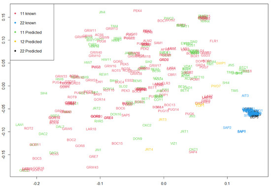Multidimensional scaling plot of dog breeds with various hair lengths according to SNP variations. The plot was created on the basis of pairwise distances calculated from SNPs of the haplotype block 20 (CFA13:8,530,000−8,730,000 bp) linked to the RSPO2 3’ UTR region. The genotypes of RSPO2 3’ UTR in the top left of the plot were described as follows: “11” for homozygotes of the RSPO2-wildtype allele, “22” for homozygotes of the RSPO2-repeat allele, and “12” for heterozygotes. The words “known” and “predicted” indicate the use of available data (Cadieu et al. 2009) and prediction using the linkage analysis in this study, respectively. For information on the abbreviation of each breed, refer to Table S1.