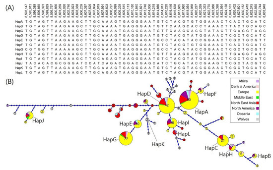 The haplotype block associated with the RSPO2-repeat was estimated for the 200 kb region (CFA13:8,530,000−8,730,000 bp), which showed a selection signature. A total of 224 individuals−55 belonging to 19 breeds homozygous for RSPO2-repeat and 169 belonging to 35 breeds homozygous for RSPO2-wildtype allele−were used to define the haplotype blocks associated with the RSPO2-repeat allele (Table S1). Among the 29 haplotype blocks defined, haplotype block 20 was the largest and consisted of 57 SNPs (Table S9). For haplotype block 20, we identified 12 major haplotypes with a haplotype frequency >1% (Figure S5) that could be differentiated using 11 tag SNPs. Interestingly, a haplotype consisting of the SNPsT/G/T/A/G/T/T/A/A/G/A/A/G/C/T/T/G/C/A/A/A/G/T/G/A/G/G/G/A/A/T/G/T/C/T/A/C/G/T/A/T/G/G/A/A/A/C/T/C/G/C/T/G/C/A/T/C was highly specific to the breeds carrying the RSPO2-repeat allele, with a few exceptions (p-value = 7.13 × 10−89, Table S9). Subsequently, an additional haplotype analysis using the entire dataset of 363 individuals including heterozygotes (n = 13), genotype-undefined individuals (n = 126), and homozygotes (n = 224), was conducted using the 57 SNPs, and the 12 major haplotypes (HapA to L) were defined (Figure 6). HapA was distributed across the largest number of breeds (n = 60). Hap J was the most distant from the other haplotypes. HapD was associated with the RSPO2-repeat insertion. The distribution of haplotypes in block 20 did not have any geological associations.