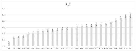 Pairwise FSTR calculated from the RSPO2 3’ UTR-associated region of the long- and short-haired Sapsarees and other dog breeds. The pairwise FSTR between the breeds was calculated based on the definition of Reich et al. (2009). The error bar at the top of each bar graph indicates the 95% confidence interval.
