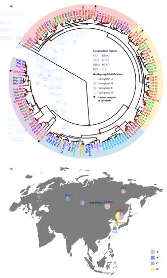 Phylogeographic distribution and Bayesian phylogenetic tree of the Siberian roe deer specimens with precise geographic localities (Data set 2, Table S2). (a) Bayesian phylogenetic tree of Siberian roe deer based on combined sequences of cyt b and the D-loop. Red hollow circles denote nodes supported by posterior probabilities over 95%. Tip labels are colored based on haplogroup. Colored letters correspond to different geographic regions that are markedin the same color. The four ancient samples from this study are shown by black stars. (b) Geographical distribution of the haplogroups revealed by Bayesian analysis. Circles are sized relative to frequency of the respective phylogenetic haplogroups (A, B, C, D). Lake Baikal is shown in blue in the bottom middle of the map. Regional abbreviations: Jeju Island in South Korea (SKJ); South Korea mainland (SKM); Primorsky Krai and Amur region of Russia and Northeastern China (RPRA); Yakutia in Russia (RYA); the Sokhondinsky Nature Reserve in the Trans-Baikal region of Russia, Buryatia in Russia, and Northern Mongolia (RSMG); Altay, Novosibirsk, Krasnoyarsk, Khakassia, and Irkutsk in Russia and Kazakhstan (RARN); the Urals, Kurgan, Orenburg, and Sverdlovsk in Russia (RUKO); Poland (PLD). The base map of global world (chart No. GS (2016)1566) was downloaded from the National Administration of Surveying, Mapping and Geoinformation of China (http://bzdt.ch.mnr.gov.cn, accessed on 19 May 2021).