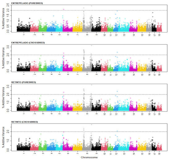 The figure presents the distribution of the additive variance along the autosomal chromosomes in the Entrepelado and Retinto populations, and for the purebred and crossbred performance. Four genomic regions can be highlighted; each explained >2% of the additive genetic variance in at least one of the populations. The SNPs at the center of each of the genomic regions that explained the highest amount of additive genetic variance, and the genes in the Sus_Scrofa 11.1. genomic map that were within 1 Mb downstream or upstream, are presented in Table 5.