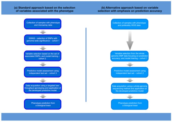 Procedure for the development and application of a phenotype prediction tool. The main differences in the procedures for developing a predictive model using the standard or alternative approach concern the selection of variables and the number of variables in the model. Consequently, the method of acquiring genetic data in the practical forensic applications of the next-generation predictive models may require whole-genome sequencing methods. Thus: (a) only phenotype-associated SNPs are included in prediction modelling, the models are not very extensive, and the methods of data acquisition can be less complex (SNaPshot, targeted MPS); (b) the selection of relevant variables (SNPs) is targeted towards improving the prediction accuracy of the model, and much more advanced variable selection methods are required. Some complex models may involve many thousands of SNPs, which, in biological traces, must be analysed using whole-genome sequencing methods that are effective for low DNA input samples.