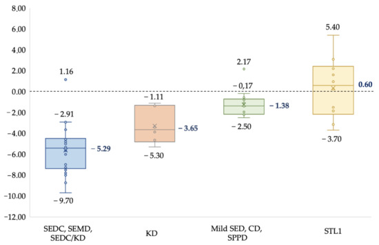 The median growth in the SEDC, SEMD, and intermediate form SEDC/KD group of patients was: −5.29 SD, in KD group: −3.65 SD, in mild forms group of SED, SPPD, and CD: −1.38 SD, and in the STL1 group: 0.6 SD. The obtained results show that the early onset of severe forms of the collagenopathy type II spectrum leads to lower growth (−5.29 SD) in contrast to the mild late forms of SED and STL1, which are often accompanied by normal growth. A radiological data analysis of patients from 1 month to 17 years old revealed growth-related transformation of the abnormal ossification of the vertebrae and epiphyses of tubular bones, remarkable metaphyseal involvement with «corner fractures», «spotted» or enchondroma-like changes in six patients (10%), platyspondyly in thirty-nine (65%), and coxa vara in thirty-one (52%). The obtained data are presented in (Table S1, Supplementary Materials).