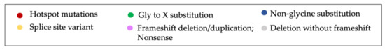 Most of the variants led to amino acid substitutions in the triple helix domain—90% (54/60)—while glycine substitution in the Gly-XY repeats predominate in 63% (34/54). Among amino acid substitutions in the triple helix domain, the most frequent substitutions were glycine to serine 26% (14/54). Among the non-glycine substitutions, a group of four probands with arginine to cysteine substitutions was found, including c.823C>T (p.Arg275Cys) in patients with CD. In the C-propeptide region, six variants were found; five of them were detected for the first time. The spectrum of amino acid substitutions identified in the sample is presented in Table 1.