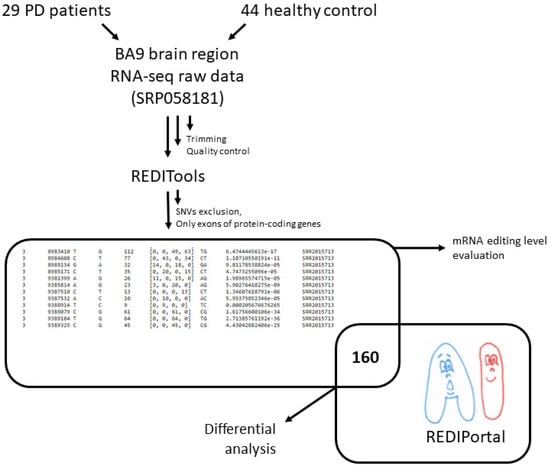 To date, a large number of studies have shown that adenosine to inosine (A-to-I) mRNA editing is involved in neurological and neurodegenerative diseases in humans []. A-to-I editing is the post- or co-transcriptional modification of mRNA nucleotides potentially influencing RNA structure and function. The brain is one of the organs preferentially targeted by RNA editing enzymes. Amyotrophic lateral sclerosis [], Alzheimer’s disease, Huntington’s disease [], and many neurological developmental disorders are among disorders associated with changes in A-to-I RNA editing patterns. Thus, the human brain seems to be highly vulnerable to dysregulation of RNA editing, as above-mentioned. However, PD is yet to be investigated for RNA editing levels and specificity. Therefore, a search for potential edited sites in the BA9 brain region and differential analysis of such sites was conducted to fill this gap. The analysis was performed on RNA-Seq data from open sources [].
