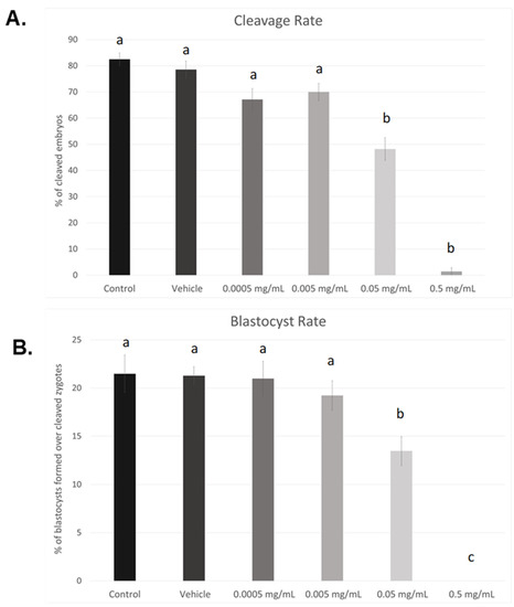 Dose–response curves after in vitro exposure of bovine oocytes to BPF. (A) depicts cleavage rates determined 24 h after fertilization. (B) represents blastocyst rates measured 8 days post-fertilization. Treatment groups include control (IVM + H media only), vehicle (IVM + H + 0.1% ethanol), and 4 serial dilutions of BPF (0.5 mg/mL, 0.05 mg/mL, 0.005 mg/mL, and 0.0005 mg/mL diluted in 0.1% ethanol and IVM + H media). Different letters indicate significant differences, with b and c representing p-values of <0.05 and <0.0001 versus a, respectively. Error bars represent ±SEM.