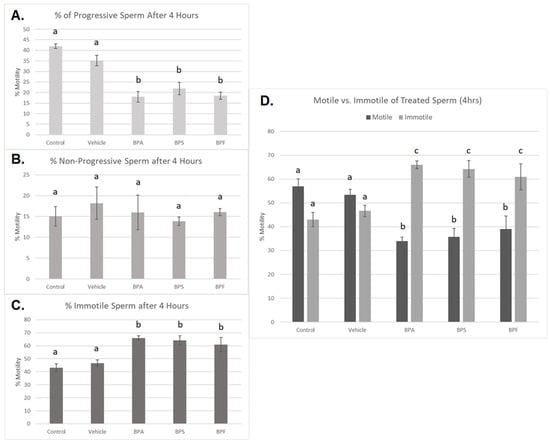 Motility of bovine spermatozoa treated with BPA, BPS, and BPF (0.05 mg/mL) for 4 h. (A) represents the % of progressive sperm, (B) represents % of non-progressive sperm, and (C) represents the % of immotile sperm. (D) demonstrates motile (both progressive and non-progressive movement) compared to immotile sperm. Different letters indicate significant differences, with b and c denoting a p-value of <0.03. Error bars represent ±SEM.
