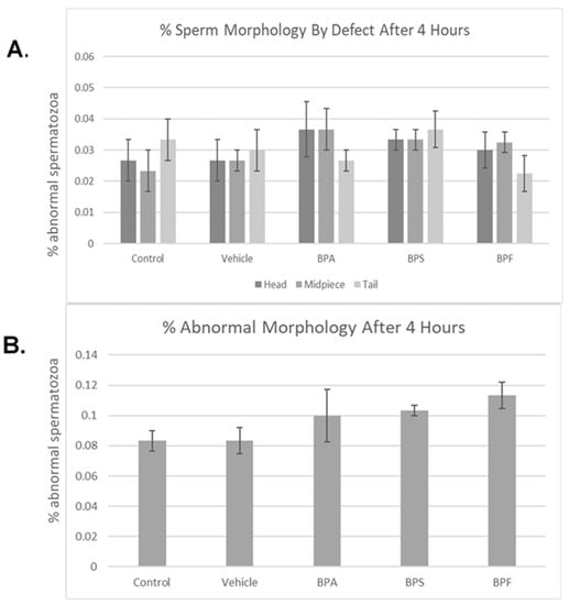 Bisphenol treatment did not affect morphology (head, midpiece, tail) (Figure 4A). When defects were combined, no notable changes were seen in the amount of abnormal sperm (Figure 4B). Overall, 4 h of incubation in bisphenol treatment had no effect on morphology, with each group yielding ~10% abnormal sperm. This was analyzed through the parametric ANOVA test, followed by Tukey’s post hoc test. As previously mentioned in Section 2.4 of this manuscript, the bull used in this study is representative of the results obtained on three other bulls (n = 4, including the bull here shown).