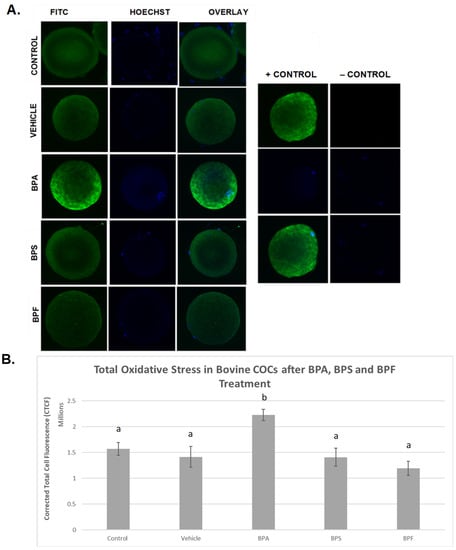 Bovine (Bos taurus) ovaries were obtained from local abattoirs (Cargill Meat Solutions, Guelph, ON, Canada, and Highland Packers, Stoney Creek, ON, Canada). COCs were collected by aspirating follicles into a medium of 1 M HEPES buffered F-10 Ham supplemented with 2% steer serum (Gibco; Whitby, ON, Canada), heparin (2 IU/mL), and penicillin/streptomycin (10,000 IU/mL/10,000 IU/mL) (Invitrogen; Burlington, ON, Canada). After aspiration, oocytes were matured in vitro using the protocol previously established in our lab [37,38]. To summarize, pools of 40 COCs were matured in 80 μL micro-drops of in vitro HEPES-buffered TCM199 maturation medium (S-IVM; M4530) supplemented with 2% steer serum, sodium pyruvate, follicle-stimulating hormone (FSH) (Vetoquino; Cambridge, ON, Canada), estradiol (5 μg/mL; E2785), and luteinizing hormone (LH) (NIH; San Diego, CA, USA). Treatment groups included control (2.5 mL S-IVM + H), vehicle (2.5 mL S-IVM + H with 2.5 μL 0.1% ethanol), and the three bisphenol treatments: BPA (239658), BPS (43034), and BPF (51453) at a concentration of 0.05 mg/mL (2.5 mL S-IVM + H with 2.5 μL of the respective bisphenol diluted in 0.1% ethanol). Estradiol was used as a physiological control as bisphenols compete with estradiol for ERs. Micro-drops were covered with mineral oil and matured in a humidified incubator (38.5 °C, 5% CO2). After 24 h of maturation, the COCs were either snap-frozen in liquid nitrogen for qPCR and Western blot use or fertilized to produce in vitro blastocysts. Maturation was assessed in 10 oocytes for each treatment group (n = 10) by identifying the extrusion of the first polar body under fluorescent microscopy while quantifying the total ROS amount.