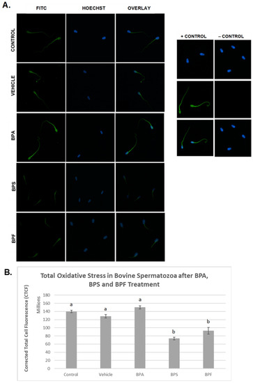 Quantification of ROS after 4 h of incubation in BPA, BPS, and BPF of bovine spermatozoa. (A) Sperm was stained with CM-H2DCFDA, which fluoresces relative to the amount of ROS produced and is an indicator of total oxidative stress. (B) Corrected total cell fluorescence (CTCF) is shown. b indicates a p < 0.03 versus a, and error bars represent ±SEM.