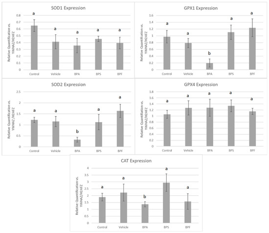 All three antioxidants (SOD2, GPX1, and CAT) were statistically reduced by BPA treatment (p < 0.05) compared to control and vehicle. This data set was analyzed through the parametric ANOVA test, followed by Tukey’s post hoc test.