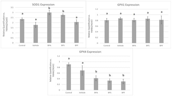 In sperm, a significant increase in mRNA expression for SOD1 was observed in BPA and BPS groups but not in the BPF group (p < 0.05). In contrast, GPX4 expression was significantly decreased in all three bisphenol groups compared to control and vehicle (p < 0.05). Lastly, GPX1 expression was unaffected by bisphenol treatment as there were no significant differences across the five groups (Figure 8). These data were analyzed through the parametric ANOVA test, followed by Tukey’s post hoc test. SOD2 and CAT mRNA could not be quantified in any treatment group, indicating that either SOD2 and CAT are not expressed in sperm or they are expressed below the detection limits of the technique used.