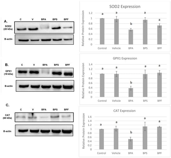 Protein levels of the antioxidant enzymes SOD2, CAT, and GPX4 were quantified in bovine COCs relative to the loading control, β-actin. The effects of BPA, BPS, and BPF on antioxidant expression can be observed in Figure 9.