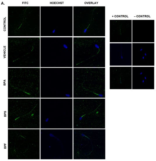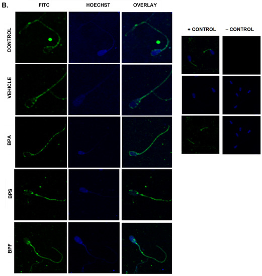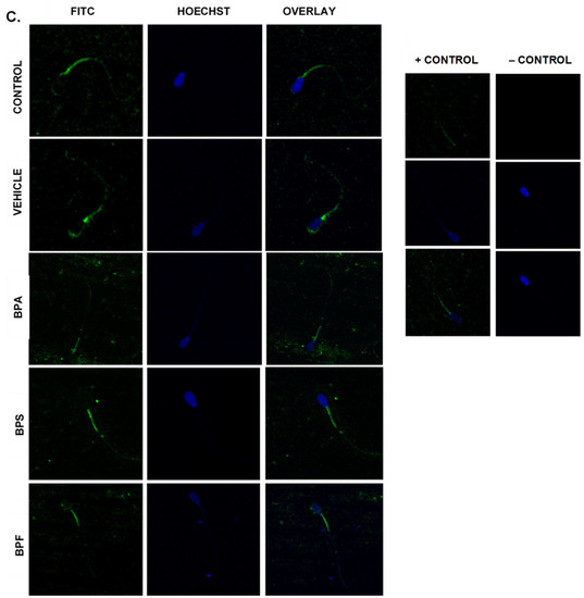 In spermatozoa (Figure 6A), the images indicate the same trend in the BPA-treated group, where fluorescent intensity in the BPA-treated groups was noticeably higher compared to all other groups. However, when intensities were quantified, no significant differences were observed between BPA treatment and controls. Unexpectedly, the other bisphenol-treated groups, BPS and BPF, had significantly decreased levels of ROS (p < 0.03) compared to other groups. This data set was analyzed through the non-parametric Kruskal–Wallis test, followed by Dunn’s multiple comparison test.