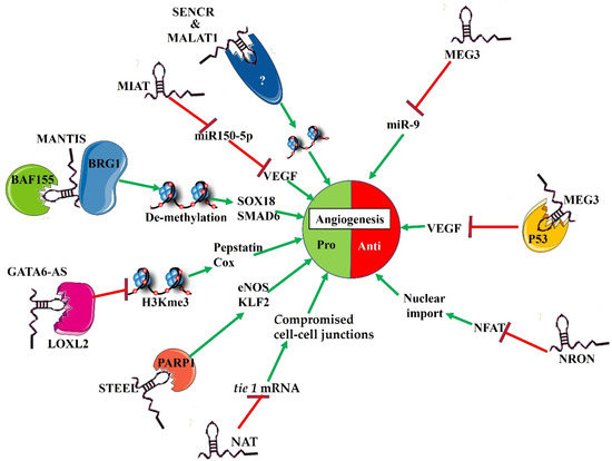 Pro- and anti-angiogenic lncRNAs. Pro-angiogenic lncRNAs such as MIAT bind to miRNA and interfere with the ability of these molecules to perform their function. LncRNAs such as NAT interfere with miRNA translation. GATA6-AS, MANTIS, MALAT1 and SENCR affect gene expression by altering methylation of target DNA. LncRNAs such as STEEL regulate the activity of transcription factors. Anti-angiogenic lncRNAs function by inhibiting the activity of molecules that stimulate angiogenesis.