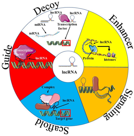 Long noncoding RNAs were classically divided into four archetypes based on their mechanism of action, namely, signalling, decoy, guide, and scaffold lncRNAs (Figure 2) [10,19,20]. Signalling lncRNAs regulate transcription by acting as molecular signals [6]. Decoy lncRNAs, on the other hand present alternate binding sites to catalytic and regulatory molecules, which include transcription factors and miRNAs [21,22]. This in turn limits the availability of these molecules and reduces their ability to modulate transcription. Guide lncRNAs support genomic positioning or localization, while scaffold lncRNAs provide a structural scaffold to enable the proper assembly of protein complexes such as ribonucleoproteins (RNP) [23,24,25]. Depending on the nature of the complex formed, it can induce transcriptional activation or suppression [25,26]. More recently, a fifth archetype, the enhancer lncRNA (eLncRNA) was described [6]. Enhancer lncRNAs stabilize and maintain chromatin loops [6,10].