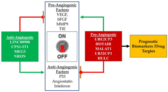 Summary of lncRNAs role in angiogenesis and the practical application of this knowledge. The angiogenic switch relies on the change in the balance between the levels or activity of pro and anti-angiogenic factors. Pro-angiogenic lncRNAs promote the activity of the pro-angiogenic factors while inhibiting the anti-angiogenic factors. The expression profile of these lncRNAs can be used as prognostic biomarkers or as targets for the development of new therapies. Anti-angiogenic lncRNAs promote the activity of anti-angiogenic factors while inhibiting those of the pro angiogenic factors.