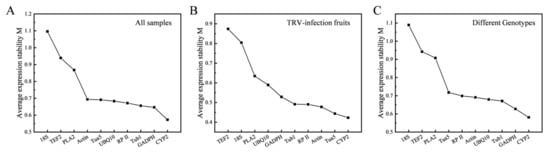 The measurement (M) values of ten reference genes were calculated by geNorm and ranked across all the samples (A), TRV-infected fruits (B), and different genotypes (C). A higher M value means lower stability, while a lower M value implies more stable gene expression.
