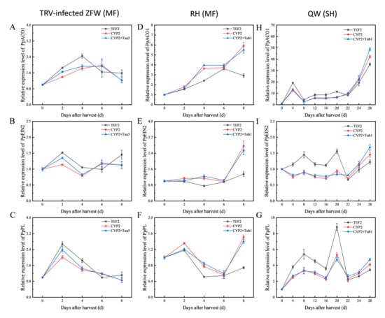 In terms of the TRV-injected fruits, it can be found that the expression levels of PpACO1, PpEIN2, and PpPL when normalized in combination with the stable reference gene and the best reference gene alone were consistent, but their expression patterns were partially similar to those of the others when normalized using the unstable reference gene TEF2. The expression level of PpACO1 that was normalized by CYP2 alone and the combination of CYP2 and Tua5, gradually increased and reached its peak at 6 DAH (days after harvest), then decreased, whereas its expression level with TEF2 as reference gene reached its peak at 4 DAH (Figure 4A).