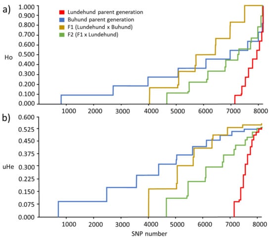 Cumulative curves of the observed heterozygosity (Ho) (a) and unbiased expected heterozygosity (uHE) (b) estimated from 8184 loci of the 4 dog groups: Lundehund, Buhund, first-generation crosses F1 (Lundehund × Buhund) and first-generation backcrosses F2 (F1 × Lundehund). The lines show a decline in the number of loci with a certain range of Ho and uHe (the lengths of the horizontal lines) per generation. In the parental generation, the Buhund has the longest horizontal lines followed by the F1 generation, the F2 generation and, finally, the Lundehund.