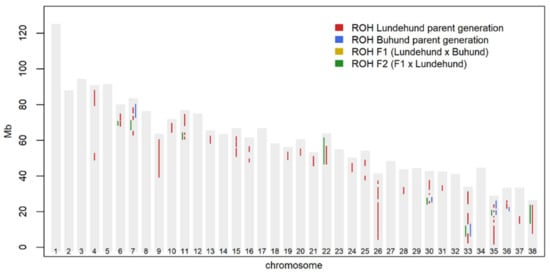 Runs of homozygosity (ROHs) indicate regions of the chromosome where a single genotype is contiguous. The ROH plot for the four dog groups showed, as expected, that the Lundehund had the highest number of ROHs, whereas no ROH was found in the first generation of crosses (F1) (Figure 3). Moreover, ROHs re-emerged in the next-generation F2, where they were more frequent and longer than those in the Buhund. The ROHs in the Lundehund included some long segments on chromosomes 9, 26 and 38 (Figure 3), and the number of ROHs per dog group was 247 for the Lundehund, 88 for the Buhund, none for the F1 and 116 for the F2.