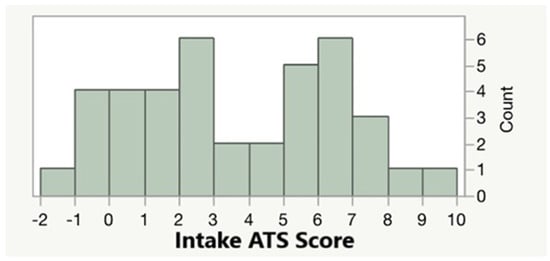 The distribution of ATS values at study intake. The distribution of the ATS in abstinent individuals is centered on zero, and scores above 4 are highly predictive of heavy alcohol consumption.