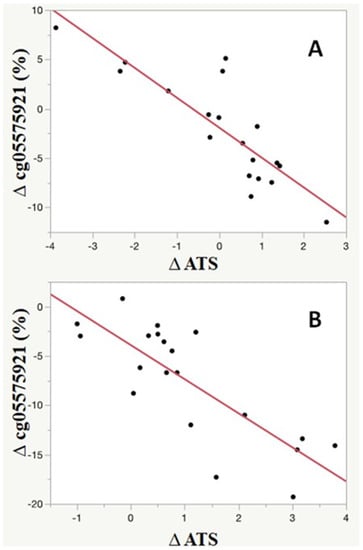 The relationship between the 90-day changes in cg05575921 methylation and ATS values for those who did not fully quit smoking (A; n = 19) and those who did fully quit smoking (B; n = 20). Although the overall magnitude of remethylation was greater in the quitters (B), the change (∆) in ATS score as a function of reduction in Scheme 05575921 was highly correlated with ATS values for both quitters (B, n = 20, p < 0.0001; adjusted R2 = 0.62) and non-quitters (A, n = 19, p < 0.0001; adjusted R2 = 0.70).