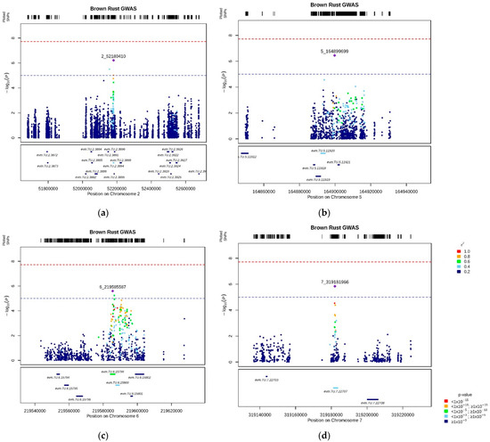 Figure 5. LocusZoom plots of the most highly associated QTL to BRR. Plots show the regions around the most significant SNPs. SNPs are plotted as the −log10 of the p-value (box on the top). The LD.Measure function from LDcorSV R-package [33] was used to estimate the linkage disequilibrium (r2) between the most significant marker in that region and all the markers within a 100 Mbp window; each SNP’s r2 is color-coded, as well as the p-value of the genes measured through MAGMA analysis (box on the bottom). The red dotted line refers to the Bonferroni threshold, while the blue horizontal line indicates the arbitrary cutoff of -log10(p-value) = 5. Each plot refers to the association of BRR to BR-QTL2 (a), BR-QTL5 (b), BR-QTL6 (c), BR-QTL7 (d), respectively.