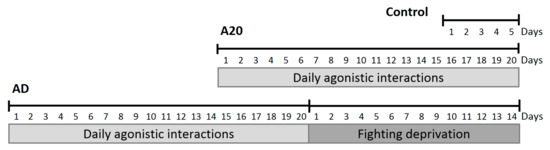 - Kudryavtseva, N.N.; Smagin, D.A.; Bondar, N.P. Modeling fighting deprivation effect in mouse repeated aggression paradigm. Prog. Neuro-Psychopharmacol. Biol. Psychiatry 2011, 35, 1472–1478. [Google Scholar] [CrossRef] [PubMed]