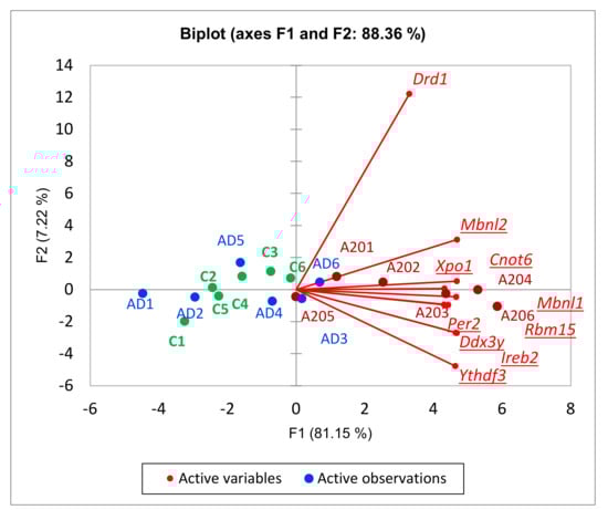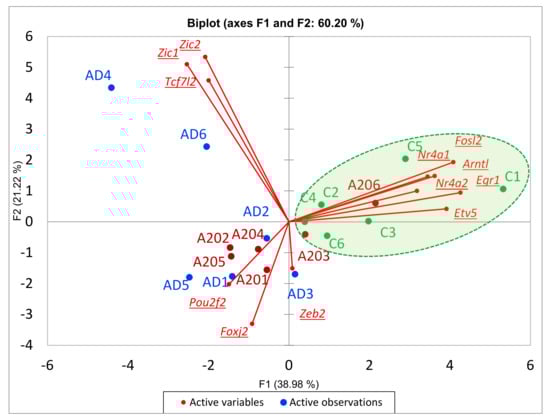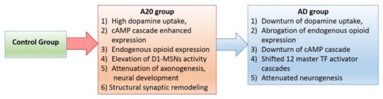 3.3.3. Dopamine-Mediated cAMP Signaling Cascade Balanced Gene Projection in A20 vs. AD Comparison