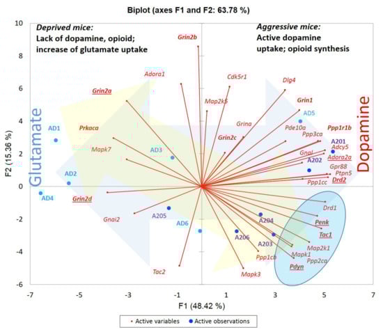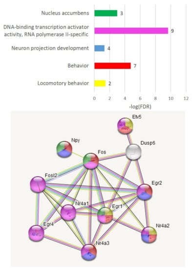 - Babenko, V.N.; Galyamina, A.G.; Rogozin, I.B.; Smagin, D.A.; Kudryavtseva, N.N. Dopamine response gene pathways in dorsal striatum MSNs from a gene expression viewpoint: cAMP-mediated gene networks. BMC Neurosci. 2020, 21, 12–14. [Google Scholar] [CrossRef] [Green Version]