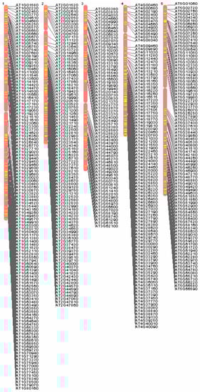 Chromosome maps of the A. thaliana genome of auxin-responsive genes were displayed by using a list of locus names (Figure 1) on the A. thaliana Information Resource (TAIR) website (http://www.arabidopsis.org, accessed on 15 October 2021). This resource is useful for determining many loci of auxin-responsive genes, and we can get a sense of their distribution on A. thaliana chromosomes 1–5. As shown in Figure 1, there is a distinctly different density on A. thaliana chromosomes 1–5 (3.8 genes/Mb on average). For example, the shortest chromosome, chromosome 4, contains almost the greatest number of loci of auxin-responsive genes (5.8 genes/Mb). In addition, there is a common feature that few or no loci of auxin-responsive genes are distributed on the centromere of A. thaliana chromosomes 1–5.