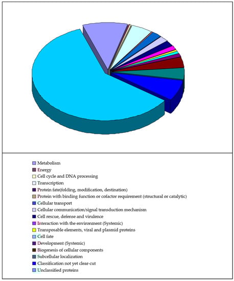 General biological process categorization on putative auxin-responsive genes. The sets of putative genes predicted in our study were analysed with the use of the MIPS from http://mips.gsf.de/ (accessed on 10 November 2021).