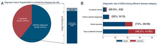 Diagnostic rate of targeted next-generation sequencing (NGS) in inherited eye diseases. (A) Overall diagnostic rate of targeted NGS and the proportion of patients who received precision medicine after genetic testing. (B) Diagnostic rate of targeted NGS among each disease category.