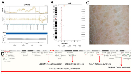 Copy number variations from targeted next-generation sequencing in a patient with ocular albinism (P47). A 5-year-old male had nystagmus since early infant. His past medical history was significant for congenital hypothyroidism, developmental delay, intellectual disability, and ichthyosis. Dilated fundus examination showed depigmented fundi and multichannel visual evoked potential showed chiasmal misrouting: (A) Normalized depth analysis on GPR143 region showed a whole gene deletion of GPR143; (B) chromosomal copy number variations called by off-target analysis using CopywriteR version 2.9.0 showed absence of read depth on Xp22.3 (red arrow); (C) dry, thickened, scaly skin was noted; (D) ChrX:3,489,126_10,217,107 deletion was confirmed by array comparative genomic hybridization.
