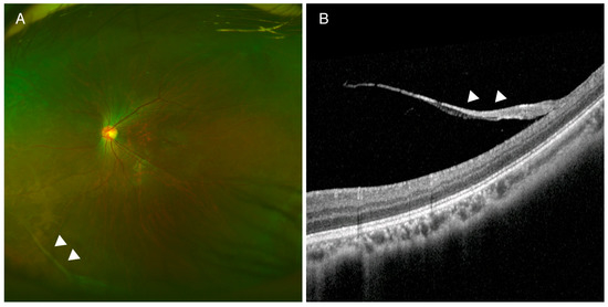 Fundus photography and optical coherence tomography (OCT) in a patient with Stickler syndrome (P12). (A) Peripheral vitreous degeneration was noted in wide fundus photography. (B) Spectralis OCT showed a thick vitreous band (arrowhead) attached to the retina. Targeted next-generation sequencing revealed a COL2A1 c.2680-3C>G variant, predicted to cause a new splicing acceptor site in intron 40. Prophylactic cryotherapy was applied to prevent retinal detachment.