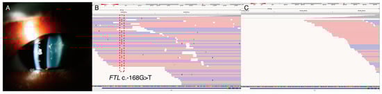 Case study 2 is an example of avoiding unnecessary treatment by using targeted NGS testing. The proband (P38) had congenital cataracts in early childhood. The mother and grandmother also had histories of congenital cataracts and had undergone bilateral cataract surgeries during their twenties. His mother had elevated ferritin levels, and repeated phlebotomies had been performed to reduce the burden of iron overload. Targeted-panel NGS revealed c.-168G>T in the FTL gene (Figure 4). This upstream regulatory variant was previously reported as pathogenic in hyperferritinemia-cataract syndrome [31], therefore, we included this region in the design of the targeted panel (Table S2). Individuals with hyperferritinemia-cataract syndrome do not have an excess of iron; repeated phlebotomies in these patients may cause anemia. Correct diagnosis of hyperferritinemia-cataract syndrome is important to avoid unnecessary treatments or invasive procedures, such as repeated phlebotomies or liver biopsies.