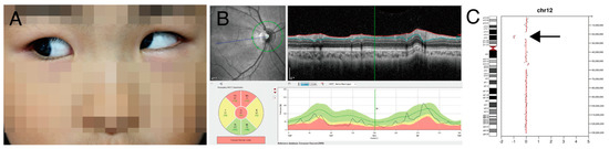 Case study 3 illustrates that chromosomal CNV was identified after targeted NGS. A 4-year-old girl (P86) presented at our clinic for strabismus. She had micrognathia, developmental delay, and hirsutism (Figure 5A). Dilated fundus examination showed optic atrophy in both eyes (Figure 5B). At the age of 8 years, best-corrected visual acuity was 20/50 in both eyes. Targeted NGS showed 12p12 microdeletion (Figure 5C), and this chromosomal CNV was confirmed by microarray. This region included the SOX5 gene, and it was known to cause non-progressive optic atrophy and strabismus [32]. Regular monitoring of cardiac function is recommended because ABCC9 gene deletion (Table S5) is known to cause pericardial effusion and cardiomegaly [33].
