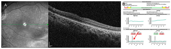 (P6) A case of dual diagnosis identified by targeted next-generation sequencing (A) Spectralis optical coherence tomography showed mild temporal retinal dragging with shallow fovea pit. (B) Hand-held electroretinogram showed severely attenuated light-adapted 3.0 response and reduced double peak in light-adapted 30 Hz flicker response (red arrow), which was consistent with incomplete congenital stationary night blindness. Targeted next-generation sequencing showed the hemizygous c.1910+1G>A canonical splice site variant in CACNA1F gene and c.3833G>A:p.(Trp1278*) nonsense variant in LRP5 gene. Dual diagnosis of familial exudative vitreoretinopathy and incomplete congenital stationary night blindness was made in this patient, and regular monitoring of bone densitometry was recommended.