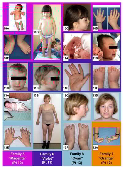 Phenotypic characteristics of the participants. Family 1 (Red background: 1A–E pt 1; 2A–E pt 2; 3A–C pt 3). (1A) At birth. (1B–E) At 3 years and 8 months of age. (2A) In the neonatal period. (2B–E) At 24 years of age. (3A–C) At 48 years of age. Family 2 (Blue background: 4A–J pt 4; 5A–D pt 5; 6A–E pt 6). (4A–E) At birth. (4F–I) At 26 years of age. (5A–D) At 1 month of life. (6A–E) At 1 month of life. Family 3 (Yellow background: 7A–C pt 7; 8A–D pt 8). (7A–C) At 1 month of life. (8A–D) At 27 years of age. Family 4 (Green backgorund: 9A–K pt 9). (9A,B) In the neonatal period. (9C–G) At 7 years of age. (9H–K) At 12 years and 1 month. Family 5 (Magenta background: 10A–E pt 10). (10A) At birth. (10B–E) At 4 years and 9 months of age. Family 6 (Violet background: 11A–F pt 11). (11A,B) At birth. (11C–F) At 1 year and 7 months. Family 7 (Orange background: pt 12). (12A): Hands at 25 years of age. Family 8 (Cyan backgroun: 13A–F pt 13). (13A) In childhood. (13B–F) At 35 years of age.
